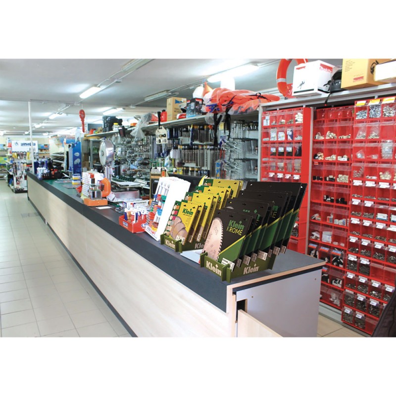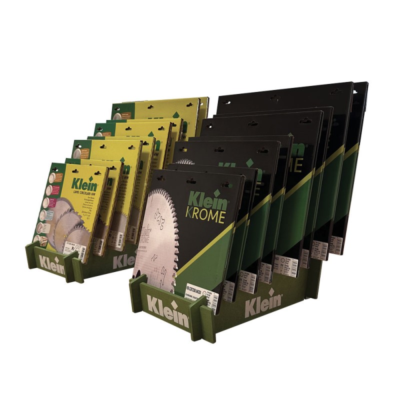 Dank dieses praktischen Tischständers haben Sie eine Auswahl an Kreissägeblättern stets gut sichtbar für Ihre Kunden. Einfach zu montieren, kann über der Ladentheke, auf einem Tisch oder an jedem anderen Platz aufgestellt werden. Der Ständer ist vollständig aus Holz gefertigt und kann bis zu 8 Kreissägeblätter mit einem Durchmesser zwischen Ø 250 und Ø 450 mm aufnehmen.